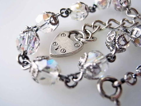 切れてしまっていたヴィンテージロザリオの、クリスタルガラス×シルバー製ビーズ(数珠)を使ったブレスレットです。 先端に可愛い錠前キーのモチーフを付けてみました。(こちらの錠前もシルバー製です) こちらのブレスレットは、延長アジャスターやチェーン、留め具(引き輪)等も全て ヴィンテージ品のシルバー製品を使用しております。 長さは18cm〜22cmのお好きなところで留めて頂けます。 ガラスビーズの大きさは直径0,9cmほど、錠前のシルバーモチーフは1,5×1,1cmとなります。 |