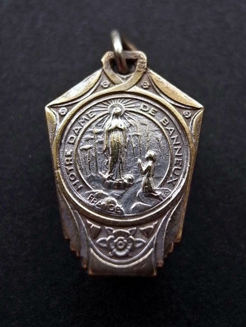 BANNEUX・バンヌの聖母マリアのヴィンテージメダイです。 1933年、ベルギー・バンヌ村の少女マリエッタの前にご出現し、病人への慰めの言葉を授けたという聖母マリア。 ご出現された小川のほとりには、後に聖母病院や礼拝堂が建てられました。 メダイの裏側には「je viens soulager la souffrance・私は苦しみを癒すためにここにいます・・」 という意味の言葉が刻まれています。 尚、こちらのメダイの製造国はFRANCEとなります。 メダイ表側と、リングを通す穴のところにFRACEの刻印入り。 素材は真鍮にシルバー系のメッキが施されていたものと思われます。 経年の摩耗でメッキが薄くなり、真鍮の鈍い金色と銀色が混ざり合った美しい色合いとなっています。 大きさは1,9×1,5cm(トップの穴の部分は含まず)です。 他のメダイやチェーンとの組み合わせも可能です。 別売りのチェーンをご希望の場合はこちらをご覧下さい。 |