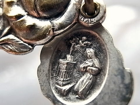 バラの花が2枚合わせになった、スライド型のヴィンテージメダイです。 (ITALYの刻印入り) 内側には「聖女リタ」と「幼児イエスを抱く聖アントニオ」が刻まれています。 聖女リタ・・・十字架に祈りを捧げている時に、キリストの茨の冠から 額に一本のとげを受けたという15世紀の聖女(望み無きものの救い手)です。 リタの死後、現在でもその遺体は腐ることなく、2000年の大聖年の時には リタの遺体はイタリアのカスシアからバチカンに運ばれ、ローマ教皇ヨハネパウロ2世を はじめ多くの信者たちがリタに祈りを捧げたそうです。 メダイでは、頭上に子供の天使の姿も表わされています。 バラの表面には、もともとは真鍮ベースにシルバー系のメッキが施されていたようですが、 経年の摩耗により色が薄れ、2色が混ざり合ったような複雑で深みのある色合いとなっています。 チェーンはシルバー系でもゴールド系でも合うと思いますので、一緒にチェーンを ご注文される場合はお好みでお選び下さい。 大きさは2枚が閉じた状態で1,2×1,cmほどとなります。 他のメダイやチェーンとの組み合わせも可能です。 別売りのチェーンをご希望の場合はこちらをご覧下さい。 |