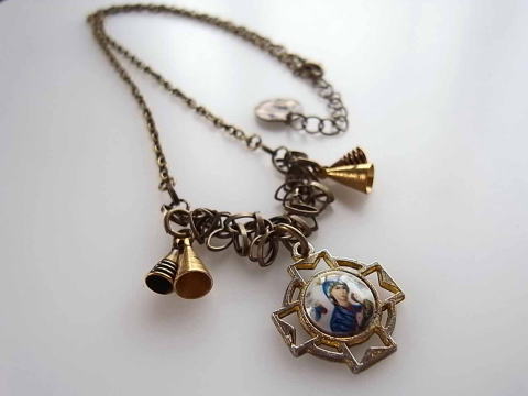 「絶えざるお助けの聖母」のヴィンテージメダイ(絵の表面は透明樹脂で包まれています)と、 真鍮の小さな円錐形のヴィンテージパーツを組み合わせたネックレスです。 幼児イエスを抱く聖母マリアの背後には2人の天使(大天使ミカエルとガブリエル) の 姿が見えます。(裏側にITALYの刻印入り) ***メダイ、真鍮パーツ以外のチェーン等は現行品となります*** 組み合わせやチェーンの変更は出来ませんのでご了承下さい。 メダイの大きさ・・・2×2cm チェーンの長さ・・・48cmに+4cmのアジャスター付き (画像では一番長い位置で留めています) |
