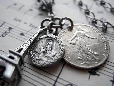 フランス、パリのエッフェル塔のヴィンテージチャーム(シルバーではありません)と フランスの聖地LOURDES(ルルド)のメダイ(ITALY製)、 1913年のフランスの50サンチームコインを組み合わせたネックレスです。 コインには、農業大国フランスの象徴のような、種をまく農婦が表されています。 この時代の50サンチームコインは、シルバーは純度800程度となります。 ルルドのメダイには、聖母マリアのお告げの場面が表わされています。 ***トップの3点以外のチェーン等のパーツは現行品となります*** 組み合わせやチェーンの変更は出来ませんのでご了承下さい。 エッフェル塔の大きさ・・・2×0,8cm メダイ、コインの大きさ・・・直径1,1と1,7cm チェーンの長さ・・・50cm |